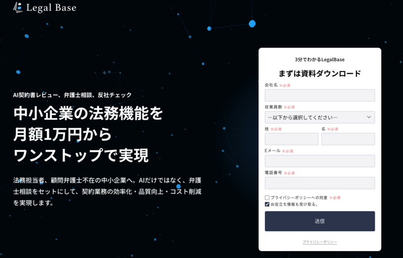 月額5,000円程度から導入可能な『LegalBase』といった低コストなものや、AIで解決できない課題をチャット等で弁護士に直接相談できる「THEMIL」も登場しています。