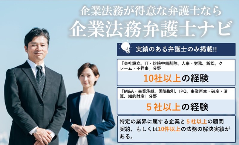実績のある弁護士をあなたの事情に合わせて探したいのであれば【企業法務弁護士ナビ】がおすすめです。企業法務弁護士ナビでは、一定の掲載基準を設けている上に、地域・業種・相談内容から弁護士を探すことができます。